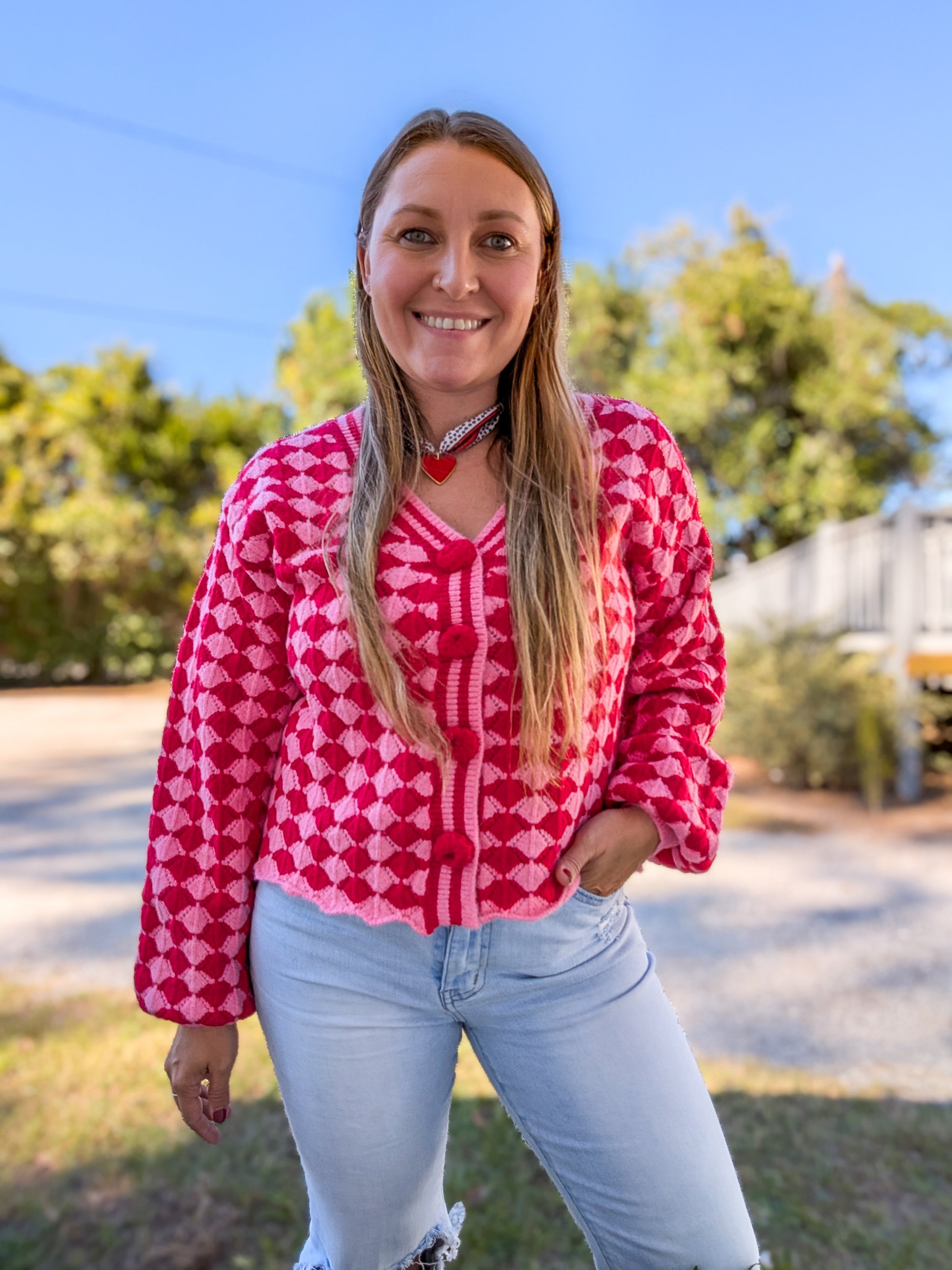 Unleash your inner fashionista with our Fantasia Cardigan! This stunning piece features a unique geo crochet pattern and vibrant red and pink colors, guaranteed to make a statement. With pearl buttons, a tie belt for a flattering fit, and the perfect two toned design, this cardigan is sure to turn heads. Elevate your wardrobe with this must-have addition!