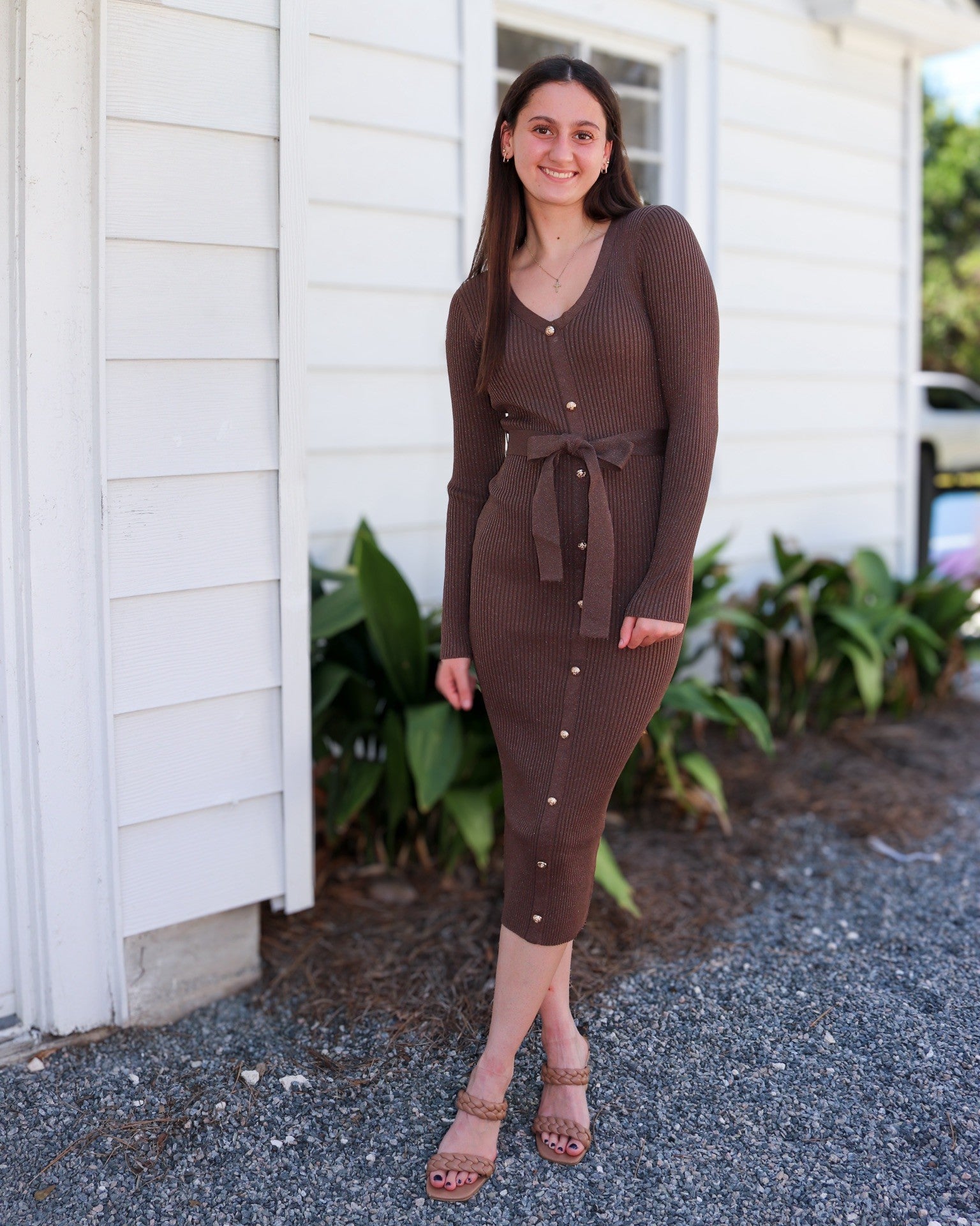 Simplify your wardrobe with our Brown Ribbed Sweater Knit Midi Dress. Made from ribbed sweater material, this knitted dress is both comfortable and stylish. Featuring a v neckline, button down design, and long sleeves, it's the perfect dress for any occasion. Plus, the belt details add a touch of sophistication. Upgrade your look today!