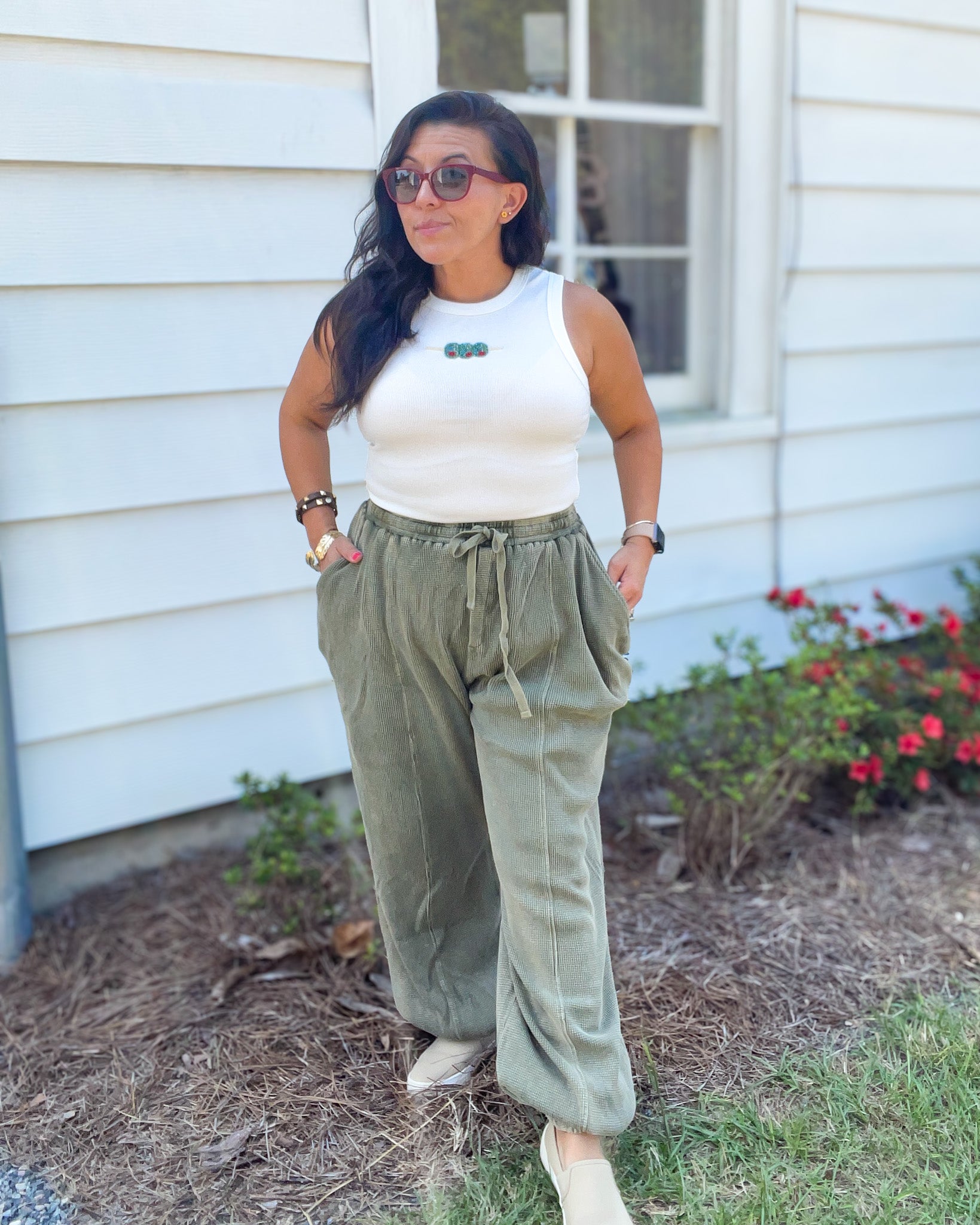 These olive waffle knit jogger pants feature an elasticized waist, front tie, and side pockets. Ideal for running errands and relaxing at home, they provide a comfortable, perfect fit while remaining breathable.