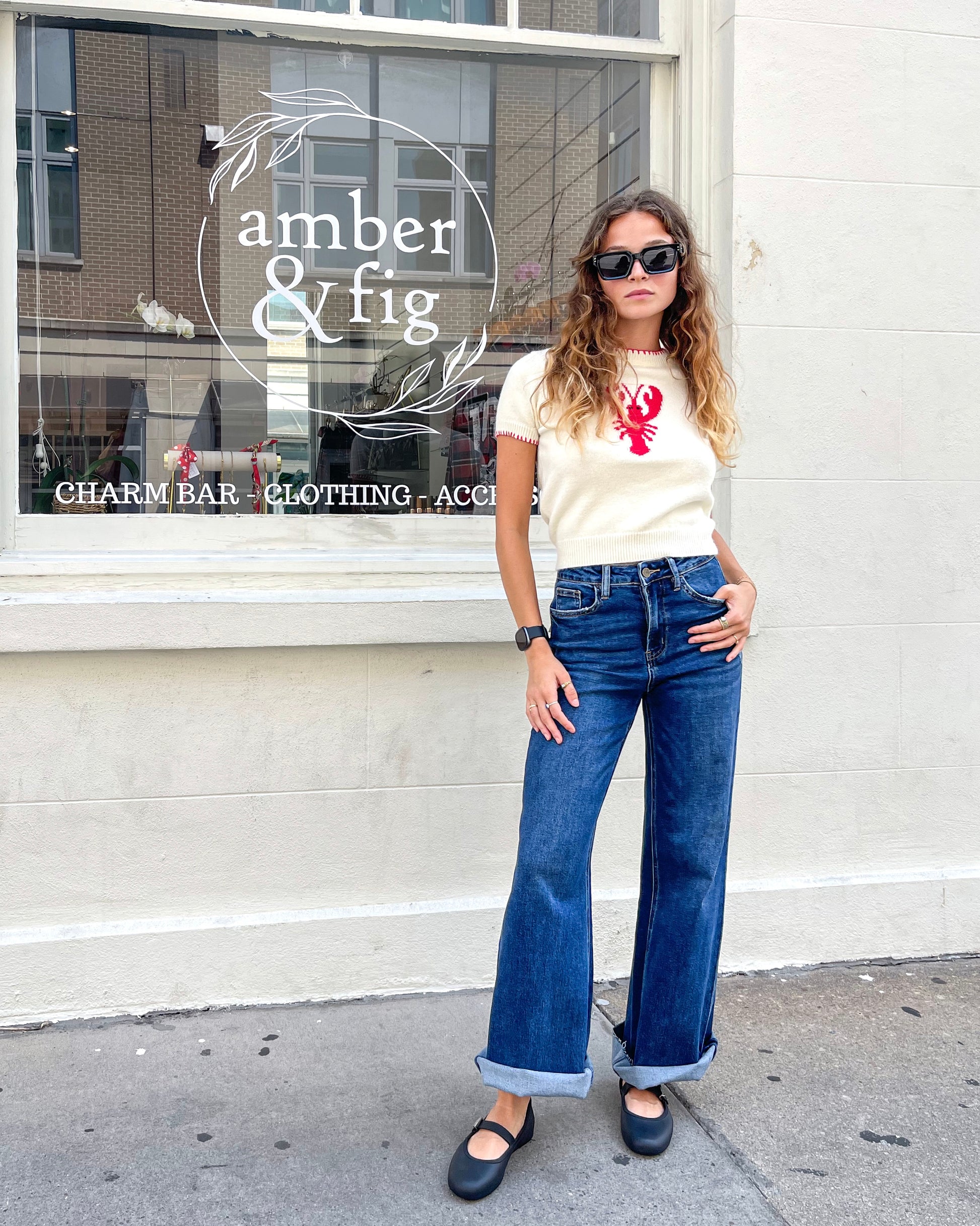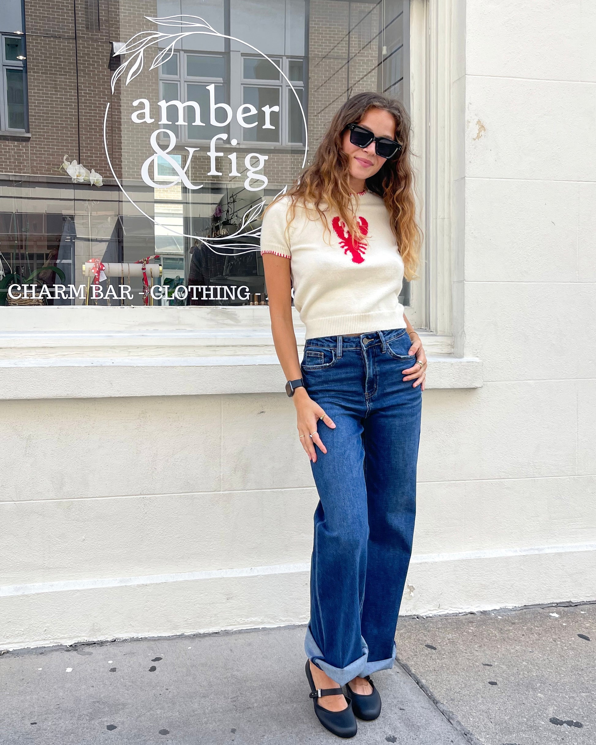 Imagine breezy boardwalk strolls and seaside picnics in the Belle Lobster Sweater—nautical, whimsical, and bursting with playful charm! - True knit sweater for that cozy, classic feel - Lobster motif for a splash of seaside fun - Eye-catching contrast stitching for a unique twist - Short sleeves keep it cool and easy to layer