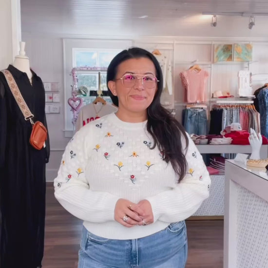 Experience warmth and style with our Bettie Embroidered Sweater! Featuring charming little flowers embroidered on a soft, comfy white sweater, this piece will elevate any outfit. Stay cozy and fashionable this season with our must-have sweater.