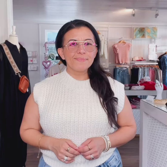 Our Chunky Handnet Tank is a white knit sleeveless sweater that is perfect for layering. It features a soft and cozy knit fabric that offers both comfort and breathability. Its classic silhouette makes for easy pairing with a range of bottoms, adding a semi-casual look that's perfect for transitioning between seasons.