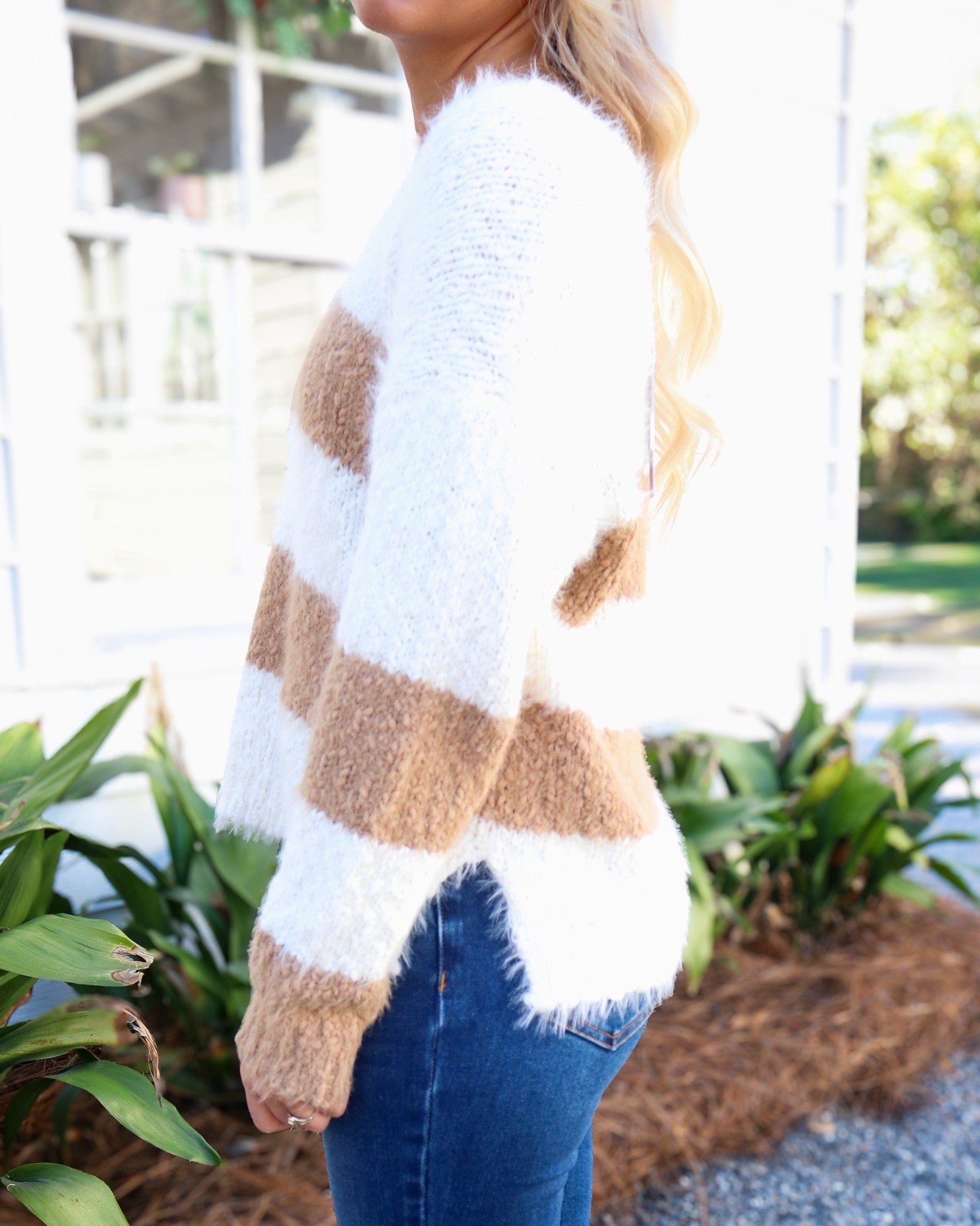 Wrap yourself in the luxurious comfort of the Emberly Fuzzy V Neck Stripe Sweater. With its soft, fuzzy fabric and cozy v neck design, this sweater is the epitome of comfort. Stay warm and stylish all season long in this must-have wardrobe essential.