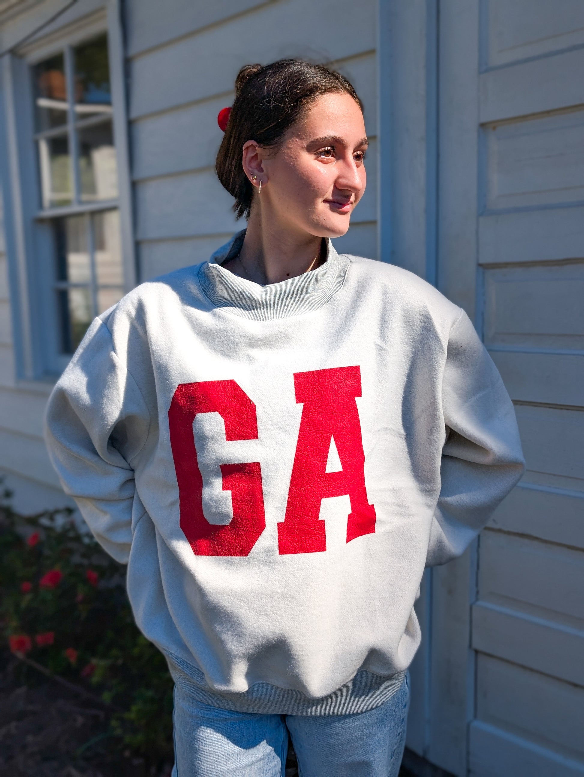 Experience comfort and style with our Georgia & Ga Print Reversible Mockneck Sweatshirt. Featuring a reversible mock neck, drop shoulder design, and long sleeves, this sweatshirt is both soft and oversized for all-day wear. Perfect for anyone who loves a relaxed and fashionable look.
