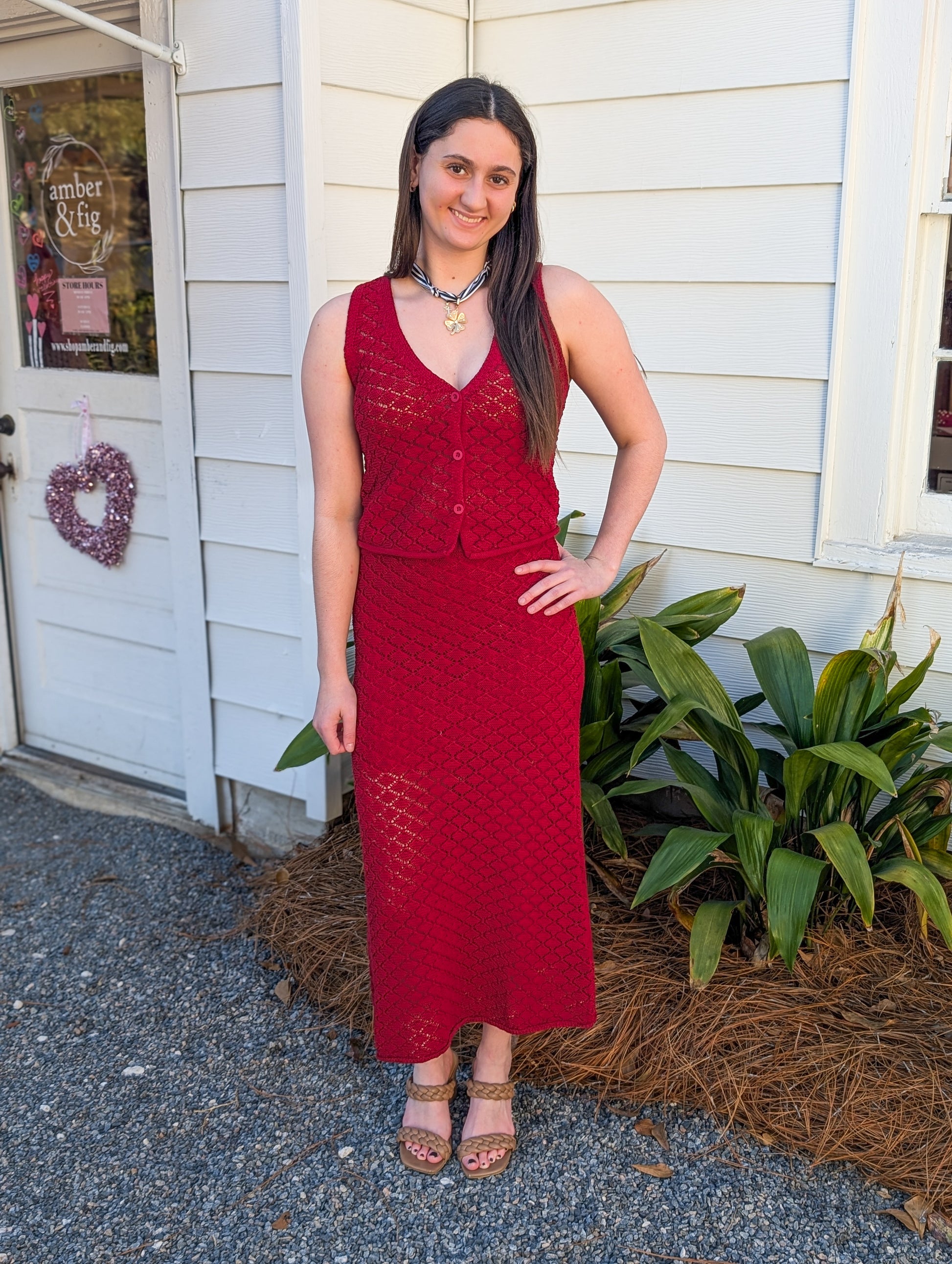 Meet the Knit Buttoned Down Vest: your new go-to for casual chicness! This loose, slightly cropped buttons down the center, making it as easy to wear as a Sunday morning. Pair it with the matching skirt! (Seriously, who doesn’t love a matching set?)